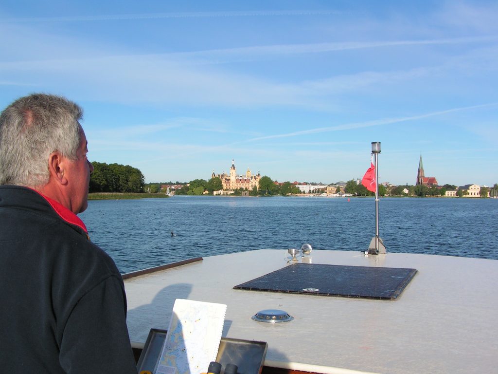 Als stolzer Skipper behalte ich den Überblick vom Freiluft-Steuerstand aus. Das türmchen-bewehrte „Märchen“-Schloss der Landesregierung lassen wir erst mal an Steuerbord liegen. Nach dem Faulenzen in irgendeiner Badebucht wollen wir abends zu den Schlossfestspielen dampfen und danach die Schweriner Gastronomie ausprobieren.