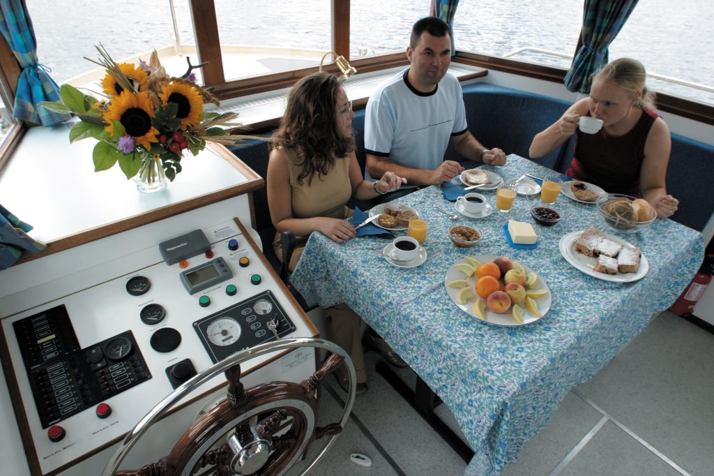 Der Abend klingt aus bei Wein und Kerzenschein im gemütlichen Salon. Leise plätschern Wellen gegen den Rumpf – eine traumhafte Einschlafmelodie in kuschligen Kojen. Der Wind lässt die Blätter rauschen, durch die der Honigmond blinzelt. Kuckuck und Nachtigall schicken ihre Melodien über das Gewässer.