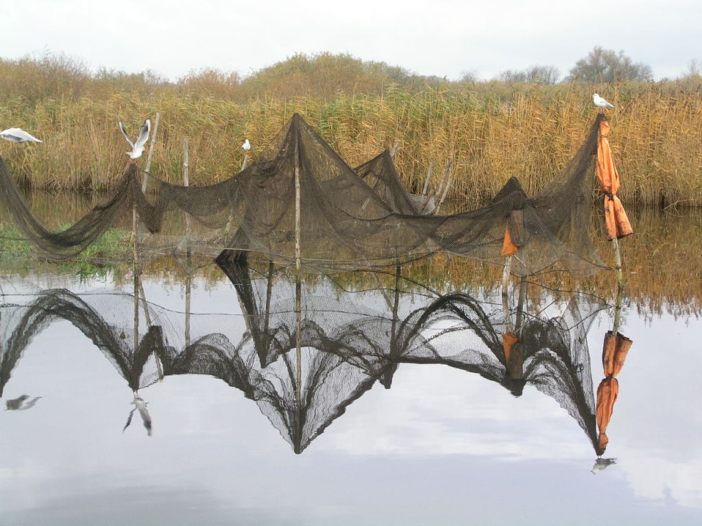 Ein paar Fischer lassen ihre Netze nach nächtlichem Fang in der Morgensonne trocknen, während ich als touristischer Hobby-Angler – in Mecklenburg-Vorpommern angelscheinfrei – regungslos am Schilfrand in meinem Kahn sitze und auf einen Biss warte.