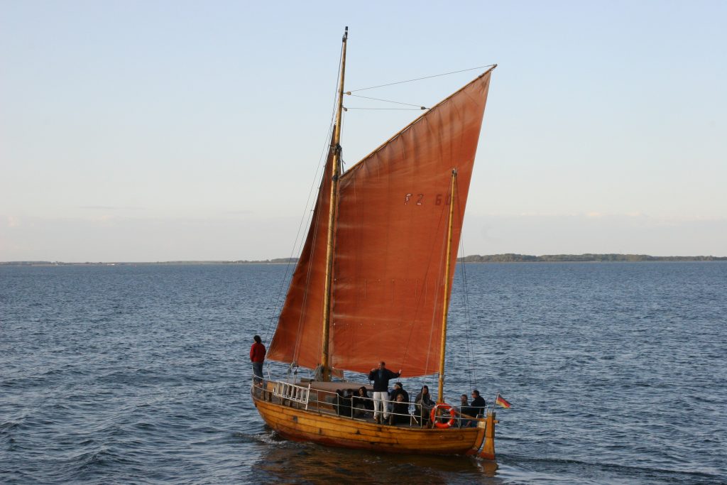 Die Fahrt mit einer Zeese ist ein Höhepunkt: wenn die teerbraunen Segel an den beiden Masten aufsteigen und sich knatternd langsam mit Wind füllen, der Holzrumpf sich schräg legt, einen Schaumstreifen hinter sich her zieht und ein paar Möwen hungrig im Kielwasser schreien. Der Küsten-Ohrwurm „Wo die Ostseewellen trecken an den Strand”¦“ kommt mir in den Sinn, und ich beginne ihn zu summen. Wie eine Feder zieht die Zeese dahin, losgelöst von Zeit und Raum – zum Luftholen und Ballast-über-Bord-Werfen.